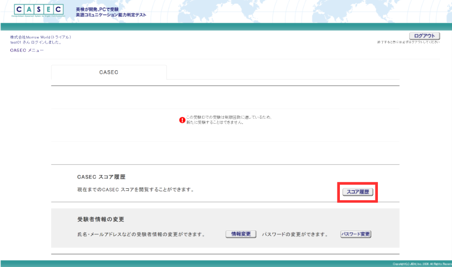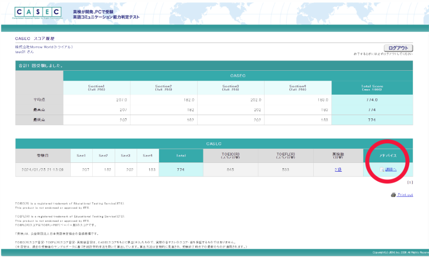 クリックすると、過去に受験したテストのスコアが表示されます。