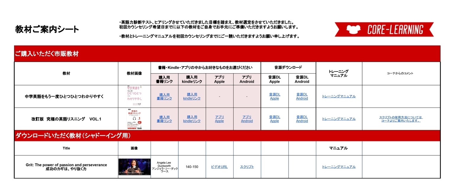 スムーズに学習を開始するために、事前にさらっとトレーニングマニュアルを確認しておきましょう。各トレーニングマニュアルは、教材をご準備いただく際にご覧いただきました「教材ご案内シート」内にリンクがございます。