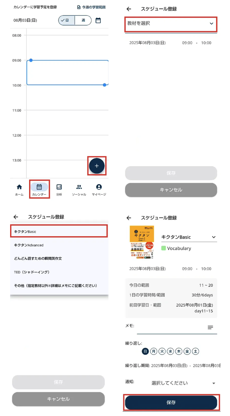 3. 「スケジュール登録」画面で教材を選択
