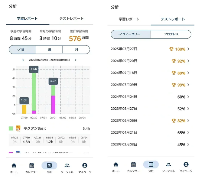 3. 「プログレス」を選択し、確認したい日付を選ぶとプログレステスト結果を表示できます