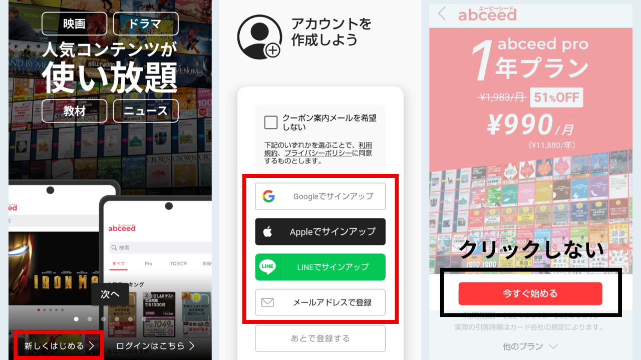 アプリを開いて「新しくはじめる」をタップしてください。(すでにabceedの会員の方は、ログインしてください。)