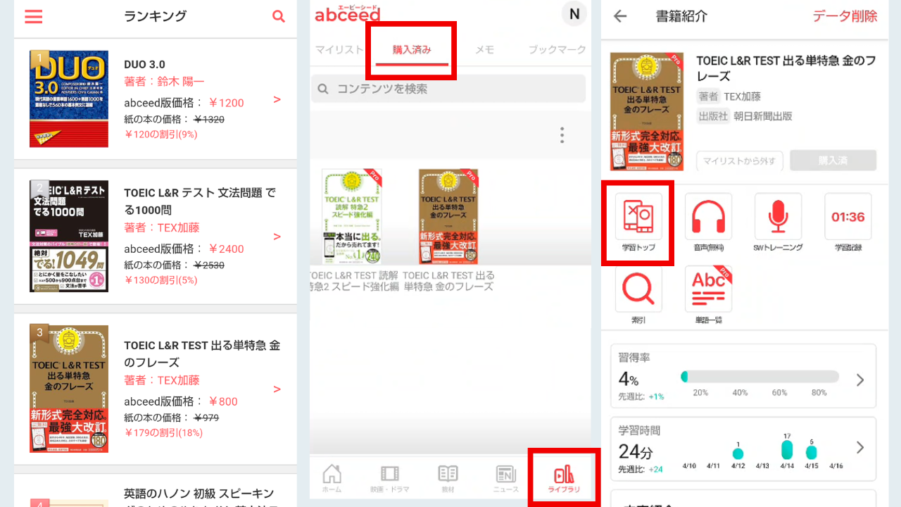 アプリ内画面の右下「ライブラリ」をタップ→上部の「購入済み」タブをタップ。購入した教材を見ることができます。