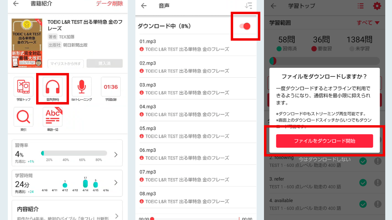 ※ダウンロードしないで音声を聞くこともできますが、毎回通信が発生しますのでダウンロードしておきましょう。