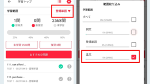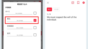 「学習範囲」のプルダウンから「全文」を選択し、学習範囲の例文を選んで進めます。