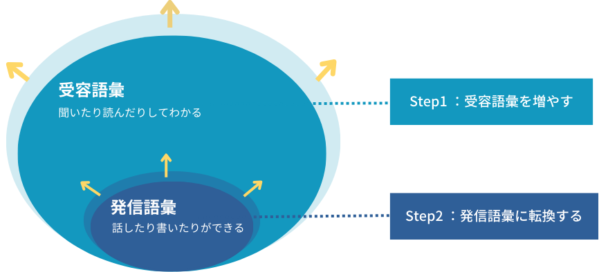 単語には、聞いたり読んだりしてわかる受容語彙と、話したり書いたりする時に使うことができる発信語彙の2種類があります。効率よく必要な語彙力を習得するためには、どちらの単語を強化するべきかをしっかりと理解することが必要です。