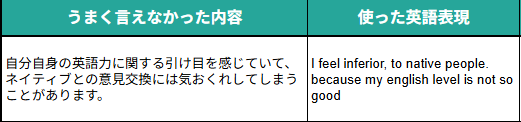 • 語彙・フレーズ不足:言いたいことに合う単語やフレーズが思いつかなかった