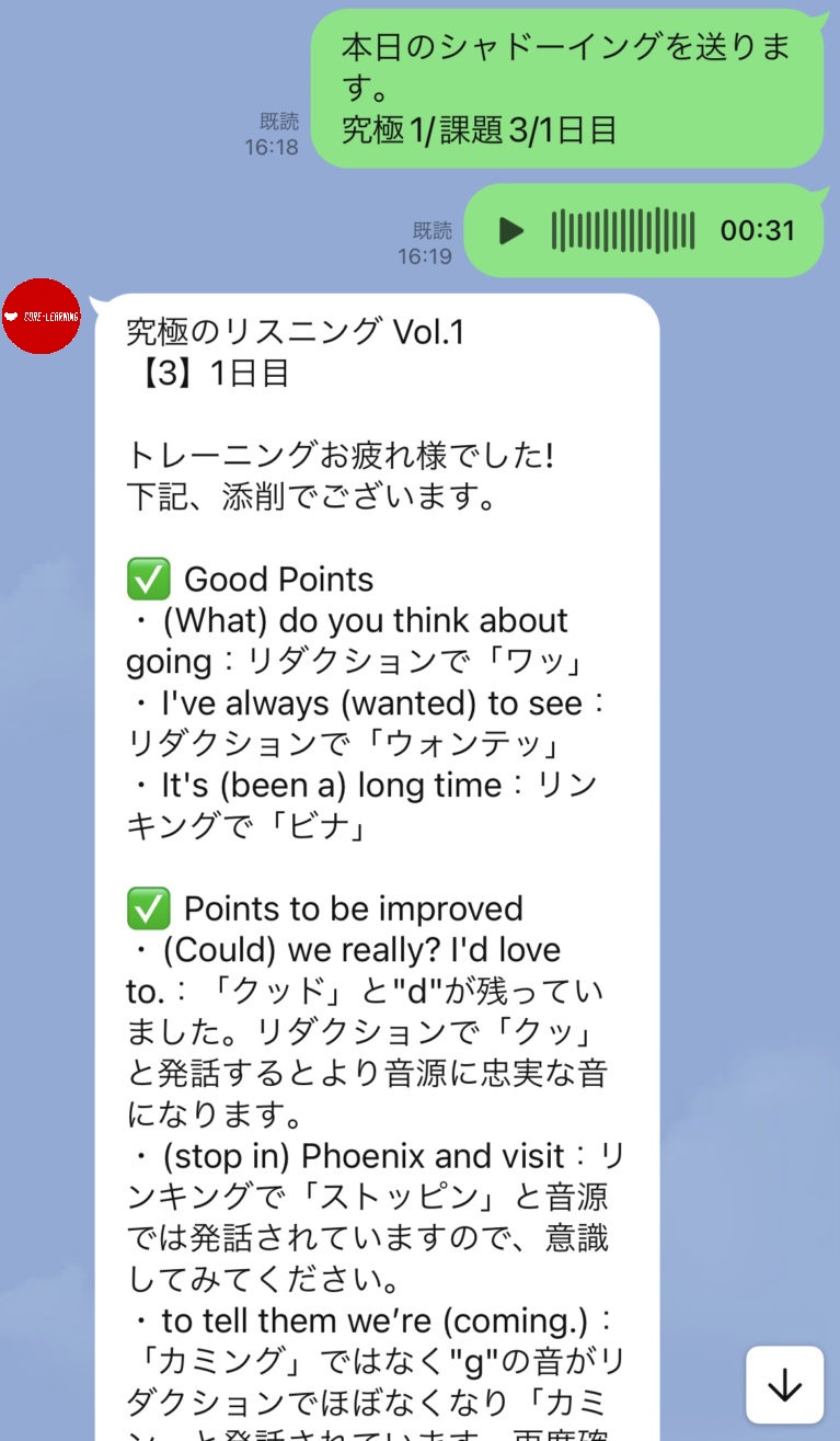CORE-LEARNINGでは、毎日シャドーイングの録音を提出いただきコーチが添削いたします。
