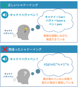 頭で覚えたものを口から出すのではなく、耳から入ったものを頭で認識して口に出します。何回も繰り返し練習することで自然に覚えてしまうのは仕方がないですが、モデル音源を追い越さないように意識しましょう。