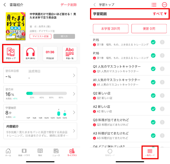 2. 下記タブの「一覧モード」を選び、「学習範囲」を選択します。