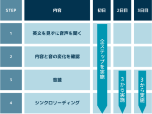 2日目・3日目のシンクロリーディングでは、スクリプトの内容を頭の中で追いかけるイメージで意味を理解しながらトレーニングを行ってください。